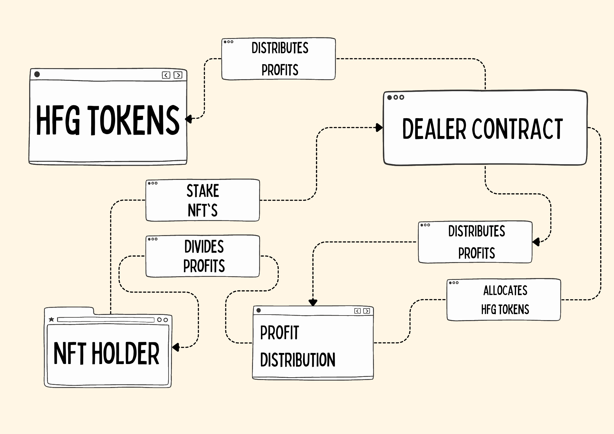3. Updating Token Balances: As profits are distributed to NFT holders, the Dealer Contract updates the token balances of each holder based on their share of the profit. This ensures that the NFT holders' HFG Token balances accurately reflect their earnings.